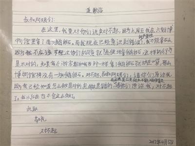????孩子的道歉信。 ????揚子晚報訊(記者 張可)南京六朝博物館想尋找一名小觀眾。上月底這個孩子跟著班級春游來博物館參觀時,悄悄拿走了展廳里用于布展的兩塊鵝卵石,幾天后他又帶著道歉信和鵝卵石,回來承認錯誤。六朝博物館的工作人員告訴揚子晚報記者,叔叔阿姨們不僅原諒了他,還想表揚孩子身上“知錯就改”的勇氣、精神,并授予他“名譽小館員”的稱號。 ????門口大廳害羞徘徊半天,終于道出實情 ????南京六朝博物館的安保人員小朱最先注意到這個孩子?!?月8日下午,看見他在博物館一樓入口處的大廳站了半天,猶猶豫豫的樣子,上去一問,伸出手遞給我兩塊鵝卵石和一封道歉信?!毙≈旄嬖V揚子晚報記者,孩子看上去很害羞,小臉通紅,說要把石頭還回來。 ????原來,今年3月31日,南京一所小學的幾個班級到六朝博物館參觀,當時這個孩子悄悄拿走了展廳里鋪在步道旁的鵝卵石。“其實31日當天參觀結(jié)束時,有老師帶著另一個孩子向售票處的工作人員還了一顆鵝卵石并道歉,但兩個孩子不是同一個人?!绷┪镳^的工作人員介紹,后來在監(jiān)控視頻回看發(fā)現(xiàn),這名送道歉信的孩子是當天媽媽騎著電動車送來的,媽媽一個人在門口的人行道上等著,讓孩子自己進去說。 ????孩子的道歉信寫得質(zhì)樸而真切。“在這里,我要對你們說聲對不起……我不應該不經(jīng)過你們的同意就隨便地拿走鵝卵石……如果每個游客都和我當時一樣拿了鵝卵石就放進口袋,那么博物館將沒有一塊鵝卵石……請你們原諒我,對不起了,我以后在(注:原文如此)也不會這么做了?!?/p>
