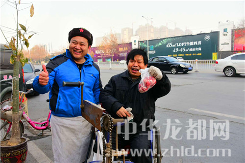 一旁的小音箱播放著歌曲《愛的奉獻(xiàn)》,在寒風(fēng)中讓人感到溫暖。