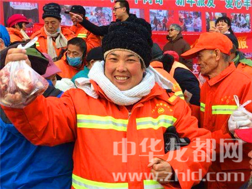 領(lǐng)到羊肉的環(huán)衛(wèi)阿姨很開心地微笑著。