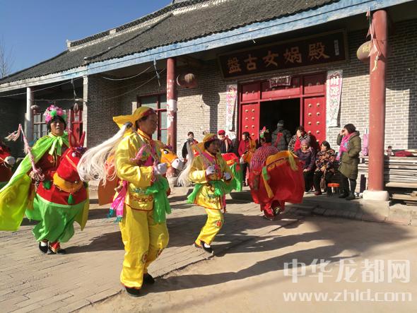 從女媧冢前向南行,有道水泥砌成的棧橋,彎彎曲曲綿延至大坑的中心,一尊女媧娘娘像披著金黃色的長衫矗立在這里,這里被香客稱為“女媧坑”。抬頭仰望,女媧娘娘發(fā)成獨髻、慈眉善目,面帶微笑俯視眾生。