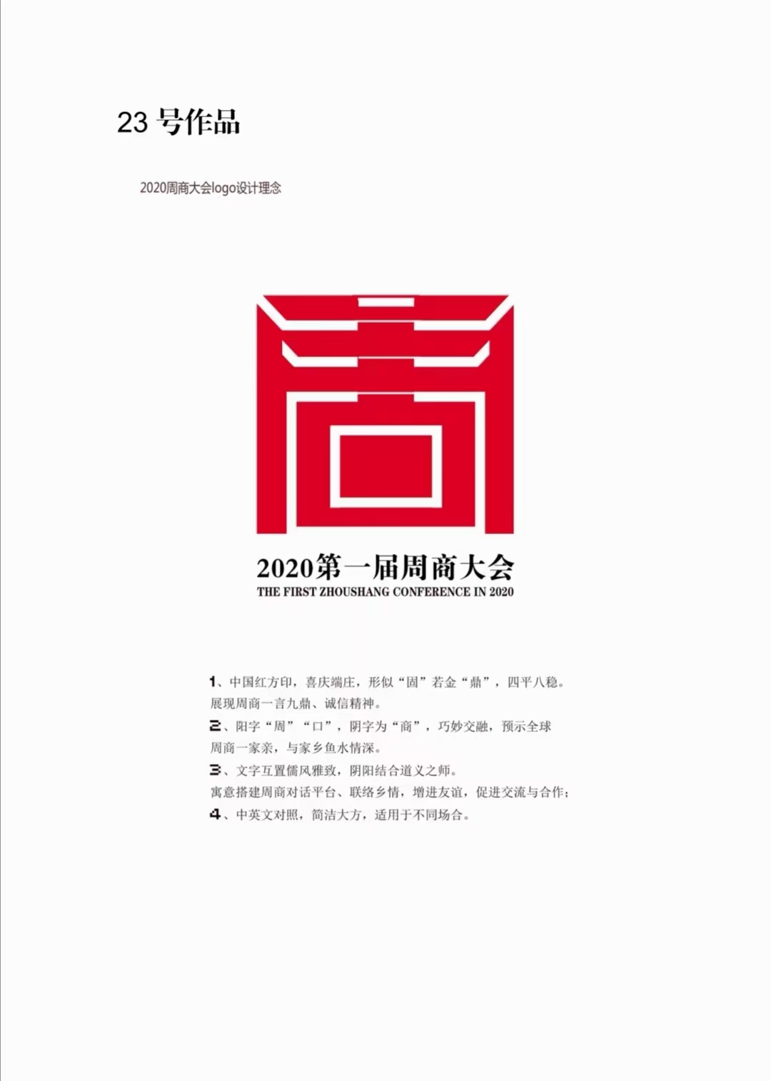 11月12日至11月19日,周口市第一屆周商大會籌備委員會面向社會公開征集第一屆周商大會主題會標,經(jīng)評審委員會評審,23號作品入選。