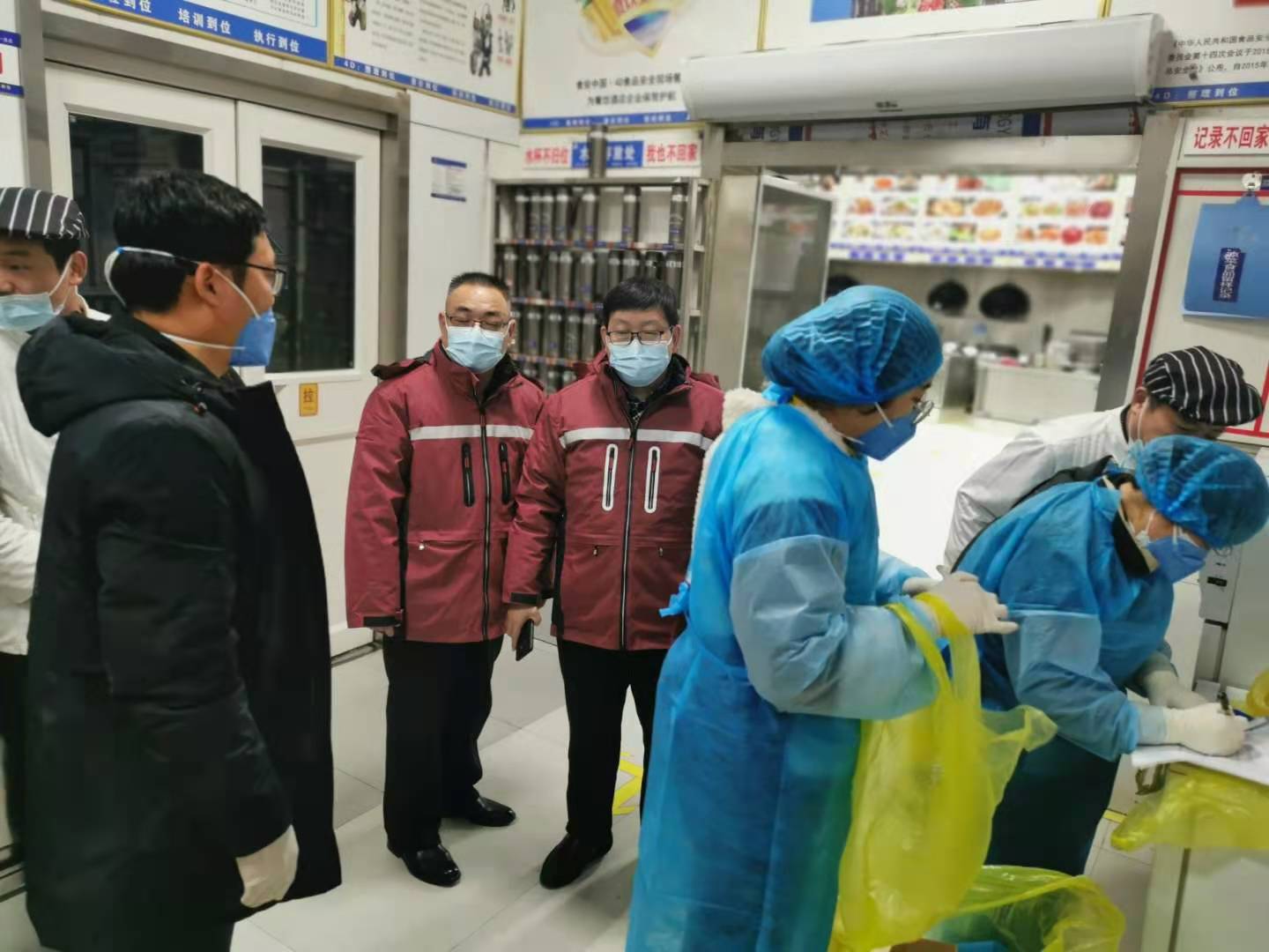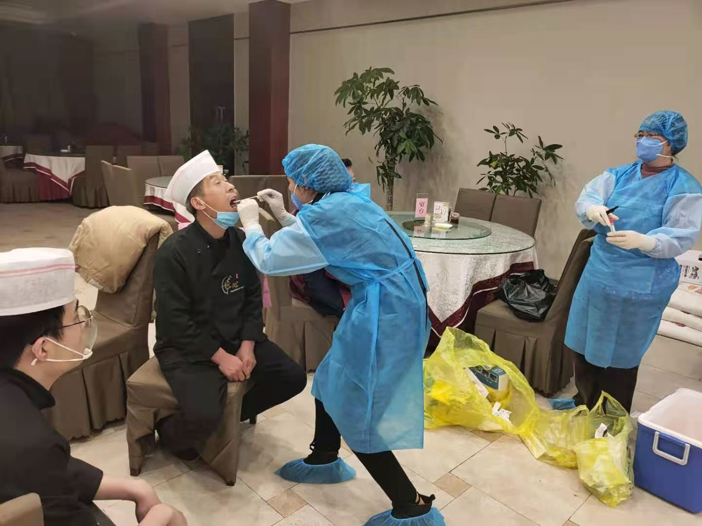 為助力第一屆周商大會(huì)圓滿成功,市衛(wèi)生健康委抽調(diào)近百名調(diào)精兵強(qiáng)將組成衛(wèi)生保障專班開(kāi)展衛(wèi)勤保障工作。圖為工作人員在市委黨校迎賓館和體育賓館餐廳對(duì)后廚人員做核酸檢測(cè)及開(kāi)展冷鏈?zhǔn)称废尽?/p>