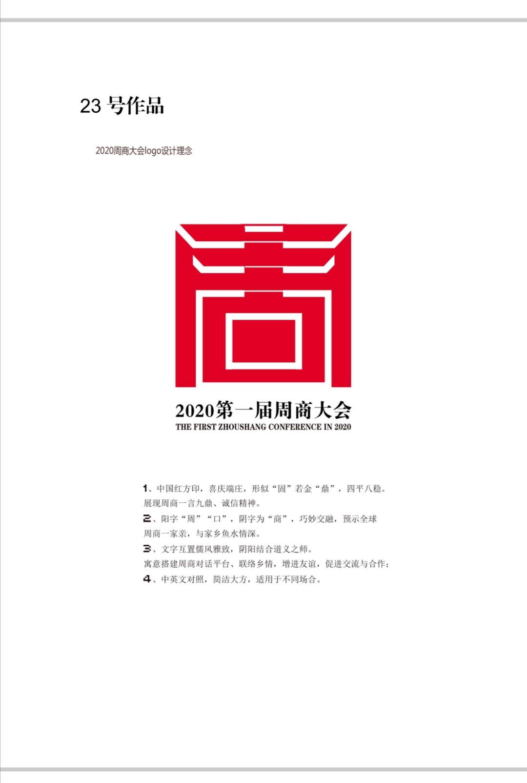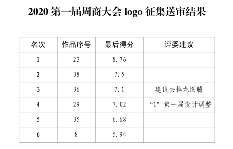 自11月12日起面向社會公開征集第一屆周商大會主題會標(biāo),截至11月19日24:00時(shí),大會工作組共征集到來自10個(gè)省轄市的作品67件。11月20日上午10:00時(shí),對作品進(jìn)行統(tǒng)一編號后,經(jīng)專家評審團(tuán)評審出55幅進(jìn)入評選,經(jīng)逐項(xiàng)打分初評出6件作品,最后按綜合得分前三名作品入圍。