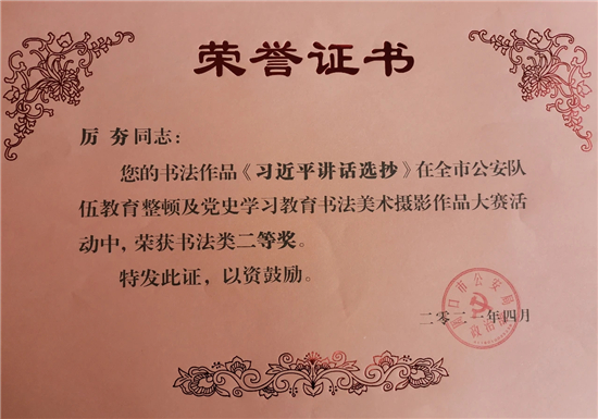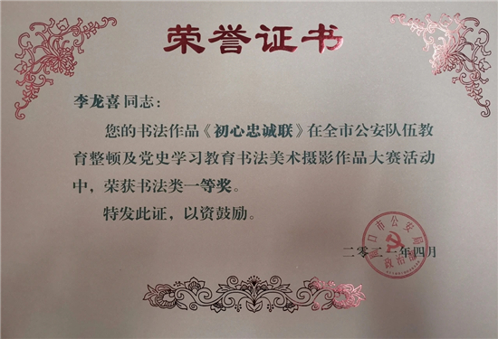 為深入推進(jìn)隊(duì)伍教育整頓及黨史學(xué)習(xí)教育走深走實(shí)、入腦入心,充分展現(xiàn)警營(yíng)新氣象,弘揚(yáng)隊(duì)伍正能量,切實(shí)筑牢民警忠誠(chéng)警魂,激勵(lì)廣大公安民輔警以更加飽滿的精神狀態(tài)全身心投入到建黨100周年安保、“迅雷”專項(xiàng)行動(dòng)等各項(xiàng)重點(diǎn)工作中,著力營(yíng)造廣大民輔警教育整頓學(xué)習(xí)和黨史學(xué)習(xí)良好氛圍,3月份,扶溝縣公安局黨委高度重視,精心組織民輔警參加了市公安局舉辦的全市公安隊(duì)伍教育整頓及黨史學(xué)習(xí)教育主題書法美術(shù)攝影作品大賽,集中推薦報(bào)送了一大批思想性、藝術(shù)性、感染性較高的書法美術(shù)攝影作品。
