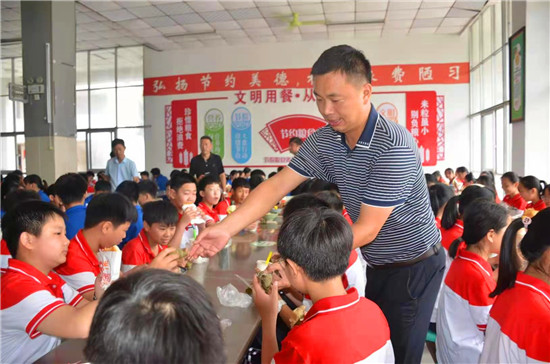 朱玉良、李繼元等詢問后勤處粽子準(zhǔn)備的充足不充足,并走到學(xué)生中去,把散發(fā)著芳香的粽子送到大家手中,一邊叮嚀著說,不夠吃再拿,不過不要浪費(fèi)。懂禮貌的孩子們雙手從校長手中接過熱乎乎的粽子,連聲說謝謝。