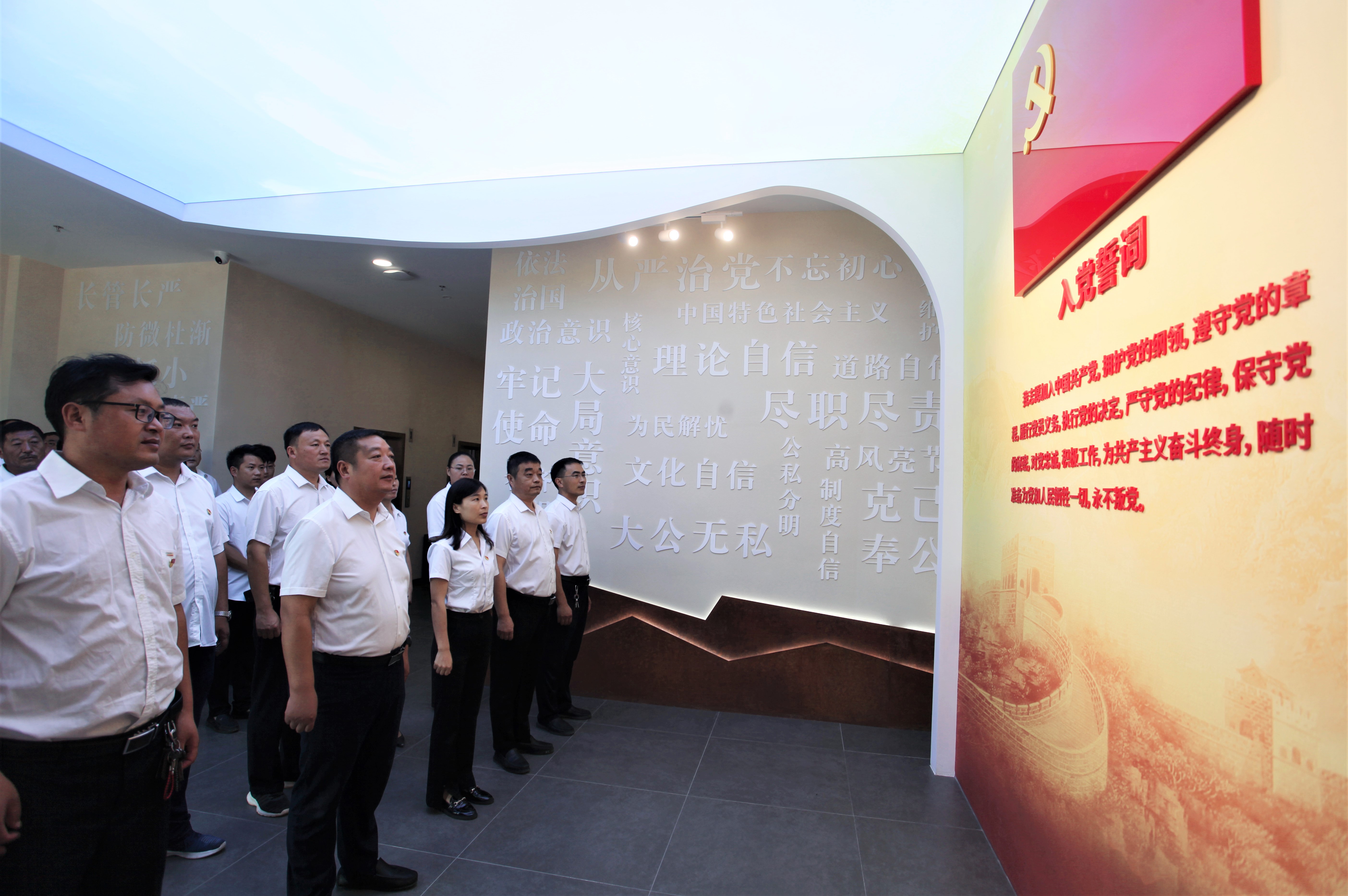 在入黨誓詞展示墻前,全體黨員干部胸前佩戴黨徽,神情莊重、精神飽滿,高舉右拳,重溫入黨誓詞,回顧初心使命。鏗鏘有力的誓言響徹現(xiàn)場。③8