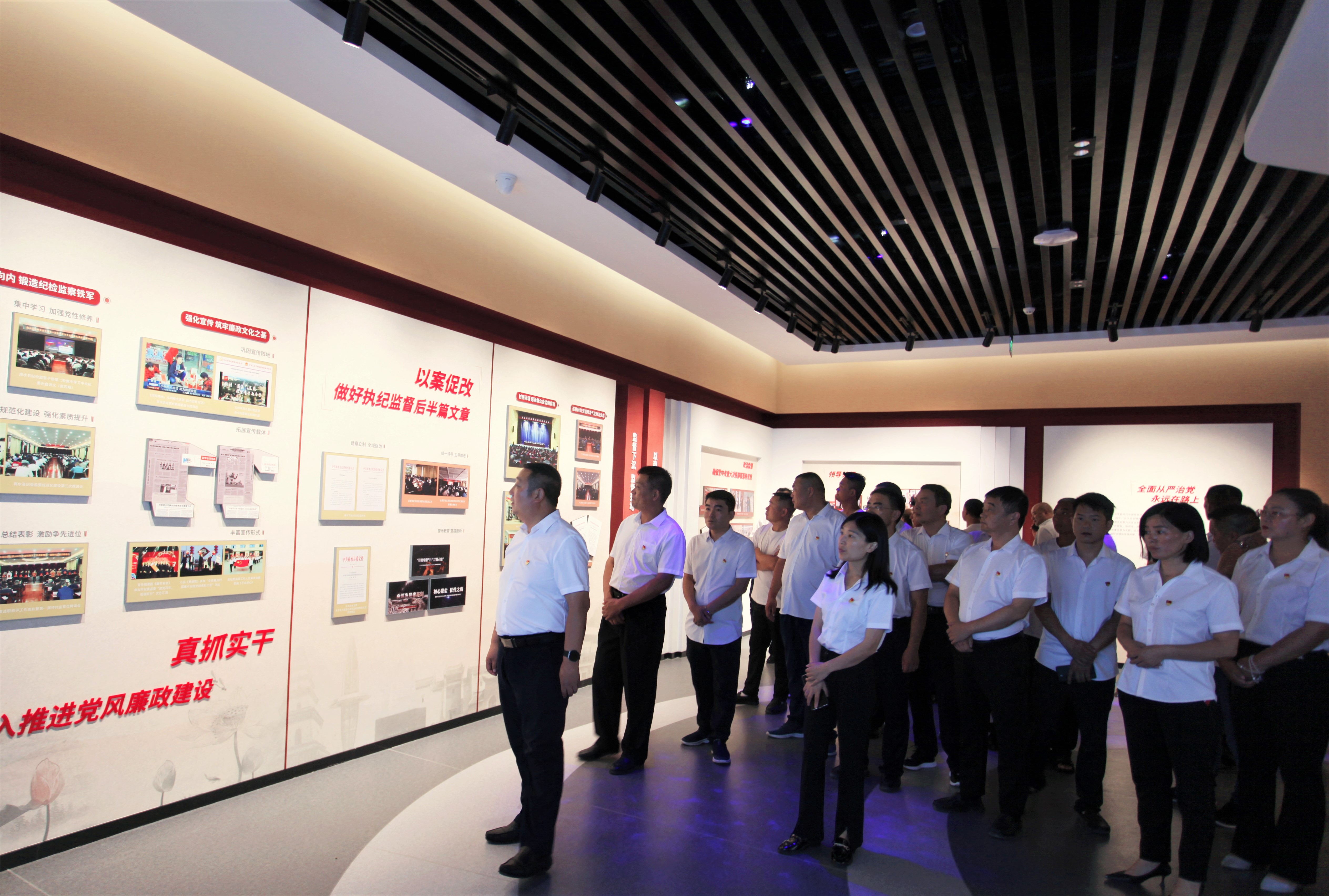 在講解員的帶領下,參觀人員認真觀看了每一塊展板、每一張圖片、每一段視頻。廉政警示教育展廳內綜合運用圖文、場景再現(xiàn)、互動體驗及多媒體聲光電等形式,從歷史的深度展示了中國共產黨歷次黨代會不斷加強紀律建設、全面從嚴治黨的偉大歷程,又展示了黨的十八大以來查處的各級領導干部嚴重違紀違法和群眾身邊的“微腐敗”案例等,將廉政文化教育、反面典型教育、理想信念教育結合在一起,形式多樣,內容豐富,既有警示又受教育。