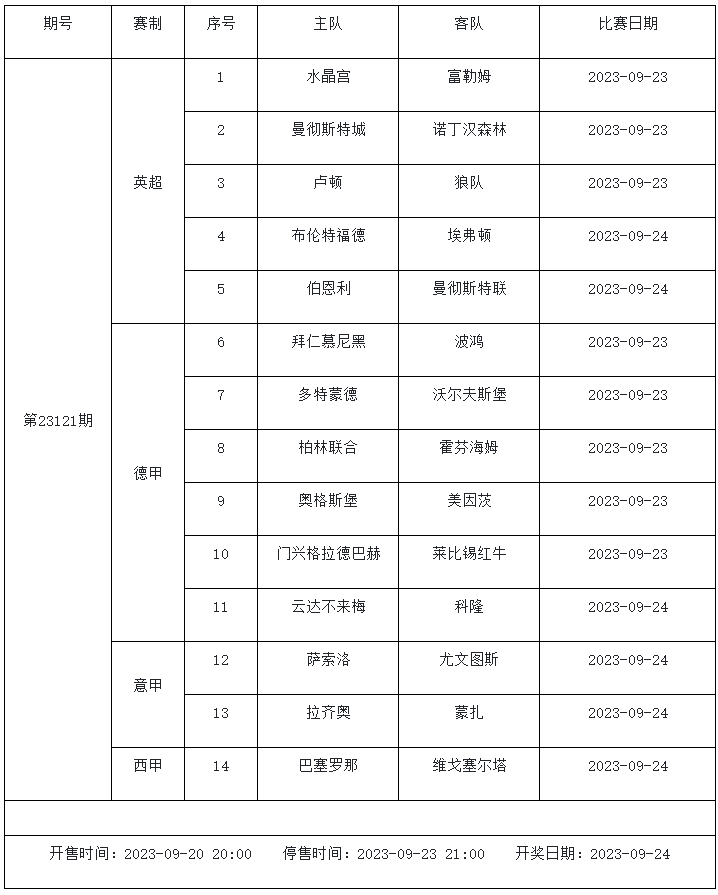 傳統(tǒng)足彩第23121期的賽事主要由英超、德甲、意甲和西甲組成。五大聯(lián)賽激戰(zhàn)正酣,豪門球隊(duì)都參加了周中的歐戰(zhàn),一周雙賽對(duì)于球隊(duì)體能有著不小的影響。其中曼城、曼聯(lián)、拜仁和巴薩等豪門都入選了本期足彩,他們能否全取三分我們一起來(lái)分析。