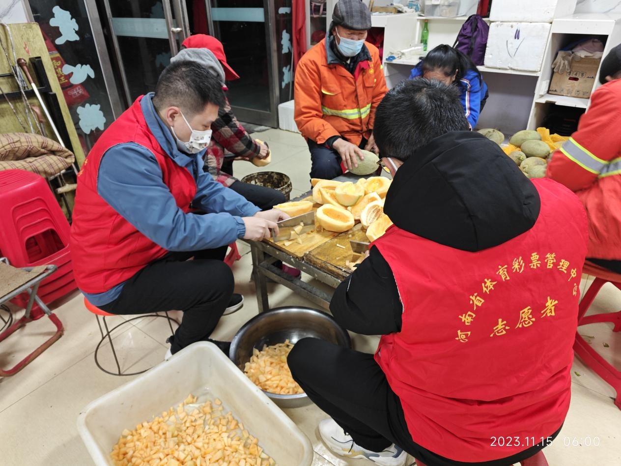 11月16日凌晨5時(shí),周口體彩分中心志愿者還到“東方愛心粥屋”開展志愿服務(wù)活動(dòng),幫助粥屋工作人員洗菜、切菜、炒菜、熬粥。