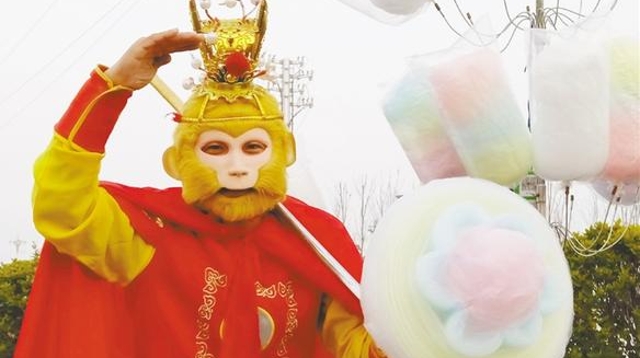 “媽媽快看,美猴王!”2月14日,在商水文化廣場(chǎng),一名身著美猴王服飾的棉花糖攤主引得市民駐足觀看。記者也隨著人群來到了這個(gè)小攤前。聽聲音,記者感覺攤主年齡不大。走近一看,只見“美猴王”從一個(gè)個(gè)小盒子將各種顏色的白糖,舀進(jìn)棉花糖機(jī)里,隨后緩緩地轉(zhuǎn)動(dòng)長(zhǎng)竹簽,不一會(huì)兒,一絲絲彩色的糖霜就纏繞在長(zhǎng)竹簽上,經(jīng)過“美猴王”的巧手制作,一朵彩色的棉花糖“花”不一會(huì)兒就做好了。