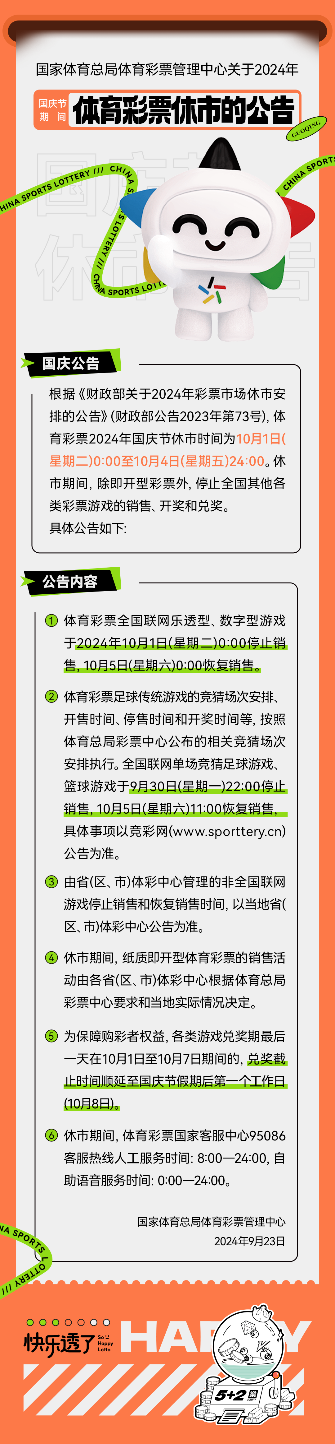 關(guān)于2024年國慶期間體育彩票休市公告