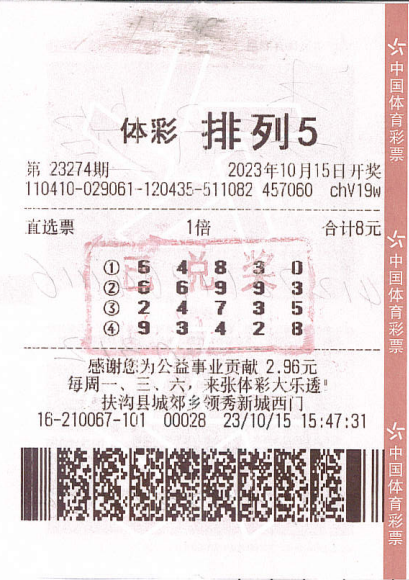 10月30日晚,體彩“排列5”第23289期開獎,開獎號碼為“9、9、8、9、3”。扶溝縣4116210087實體店喜中“排列5”一等獎1注,獎金10萬元。10月31日,中獎者陸先生來到周口體彩分中心兌獎大廳領取了獎金。 ……[詳細]