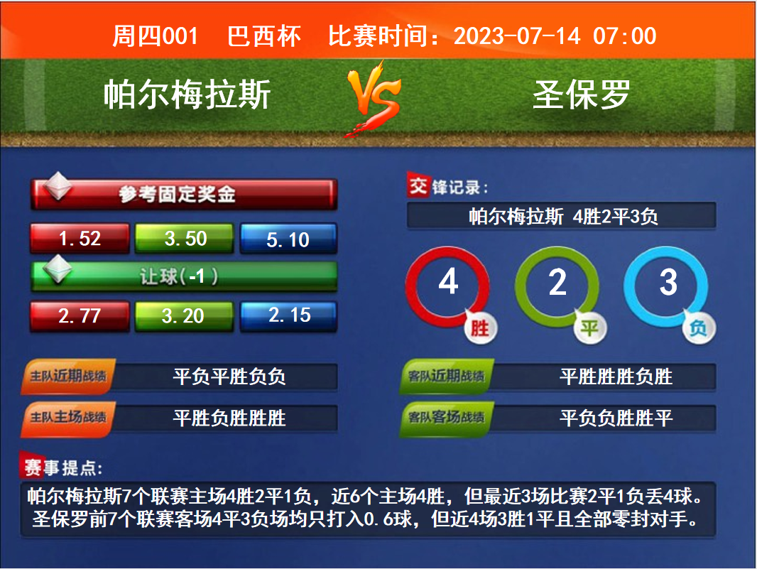 周四競彩足球強(qiáng)檔:帕爾梅背水一戰(zhàn) 圣保羅防守效率高……[詳細(xì)]
