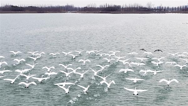 近日,市城鄉(xiāng)一體化示范區(qū)引黃調(diào)蓄湖迎來(lái)一批北飛回遷的天鵝。這群天鵝或逐日飛翔,或踏水而歌,或悠閑覓食,盡情享受遷徙途中的休閑時(shí)光,吸引眾多群眾前來(lái)觀賞。